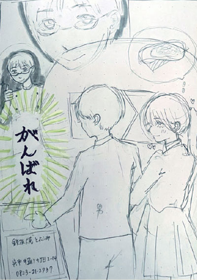 こんな気持ちでポスターつくりました 初めて鉄板焼とよふみさんを訪れた際、照明の温かさや店内の色彩から落ち着きのある上質な雰囲気を感じ、私たち高校生にとって少し背伸びをした存在だと感じました。しかし店主さんとお話をする中で、親しみやすい人柄や鉄板焼きに加えて刺身など多彩なメニューが揃っている点、また高校生でも利用しやすい価格設定であることに魅力を感じました。そこで本ポスターでは青春のひとときに寄り添うお店であることを表現することを意識しました。 手書きのイメージ図 制作メンバー 三津田高校2年(2026年3月) 左から 熊谷理子、當田由衣、中野日愛サポートデザイナー 広本理絵 FacebookXBluesky