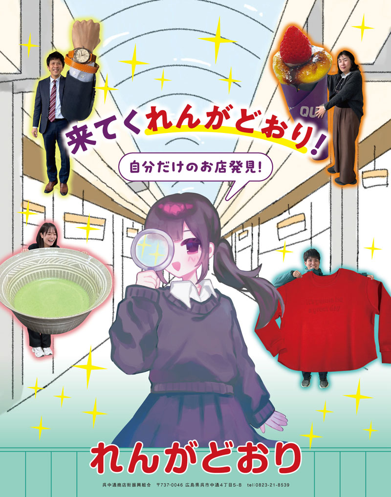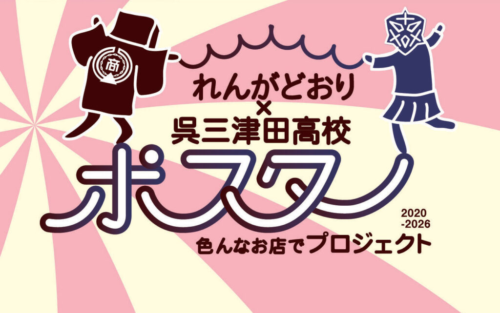 商店街の活性化を目的に、呉三津田高校の生徒有志が、地元で活躍するデザイナーの協力のもと、れんがどおりにある店舗のPRポスターを制作していく6年間(2020~2026)のプロジェクトです。